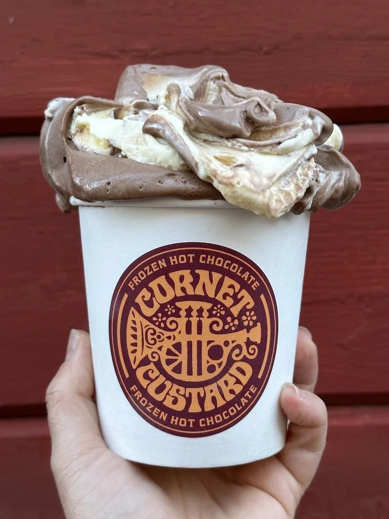 A nostalgic treat reimagined! This flavor features a swirl of super-malted semi-sweet chocolate custard and Tahitian vanilla custard, mimicking those beloved packets of instant hot cocoa with marshmallows—but elevated using premium ingredients. It's a cozy classic transformed into a luxurious frozen delight that brings back warm memories in the coolest way.