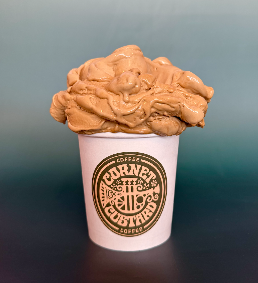 Each batch of Cornet Custard starts in a stand mixer, whisking egg yolks and pure cane sugar together until billowy thick ribbons form, and is hand tempered with a mixture of hot milk and cream, returned to the stove and cooked to a thick custard. After incredible flavors, fruits etc. are added, its all churned through an unparalleled gelato maker we retrieved directly from Italy.